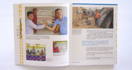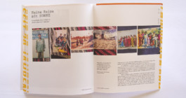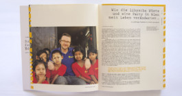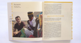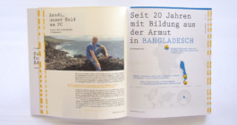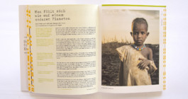 Der Fokus wird durch die Verwendung eines weißeren Papiers, durch eine alternierende Textführung, durch einen etwas größeren Schriftgrad und Zeilendurchschuss sowie durch eine Farbflattermarke am Seitenkopf visualisiert, die jedem Land eine Signature-Farbe zuordnet. Am Frontschnitt ist in zwei Leserichtungen bei leichtem Fächern des Buchkörpers „SEIT 20 JAHREN“ und „AUS DER ARMUT“ zu lesen.